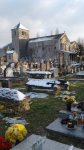 Entrer par le portail vert, c’est entrer dans le monde du silence avec quelques cyprès, un peu de mousse, des fleurs et beaucoup de pierres. Si l’on descend vers l’église, on remarque que toutes les tombes sont dans la même direction, orientées comme l’église vers l’est et le soleil levant, Jésus ressuscité le matin de Pâques offre sa lumière ainsi à ceux qui espèrent une vie nouvelle chaque matin.