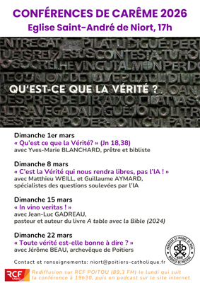 • Nous vous attendons nombreux pour la dernière conférence de Carême 2026 par Monseigneur Jérôme Beau, en l’église Saint-André de Niort, dimanche 22 mars à 17h !
