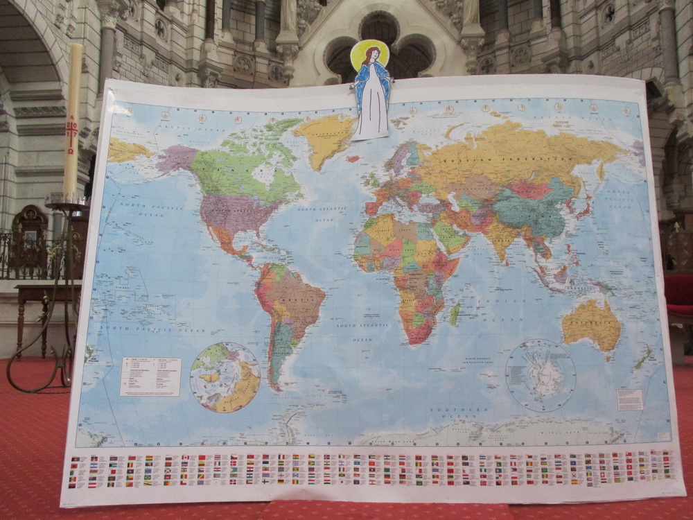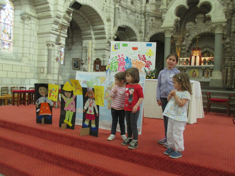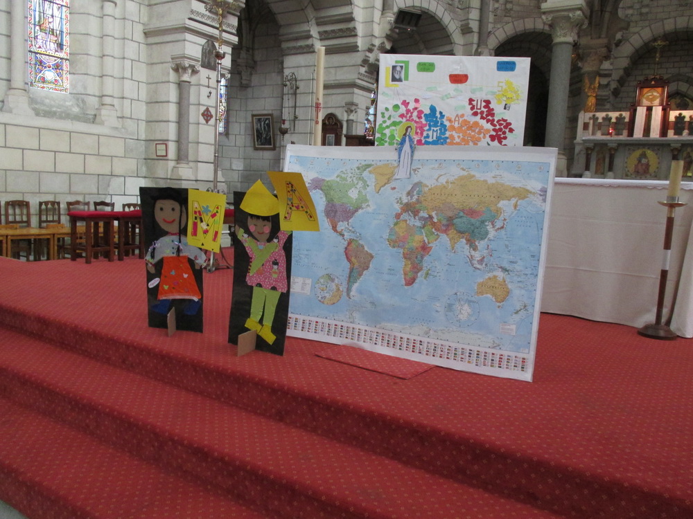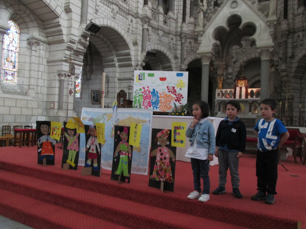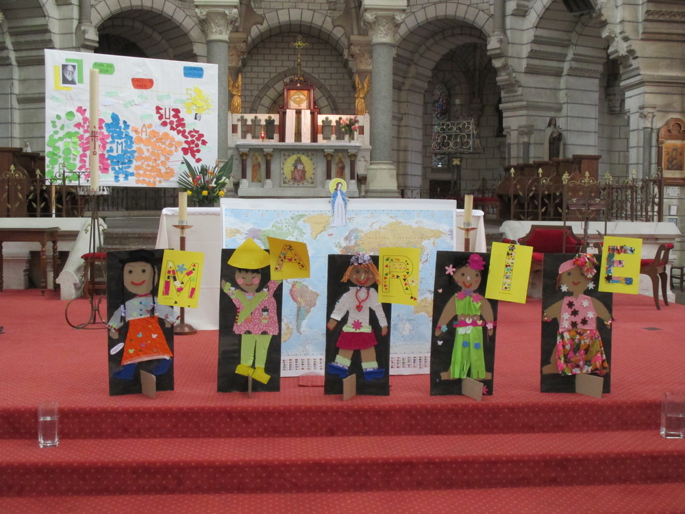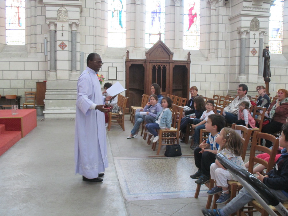 A l’église, nous confions à Marie tous les enfants du monde. Nous écoutons le récit des noces de Cana qui nous révèle combien Marie est attentive à ce que rien ne manque. « Si nous accueillons Marie dans notre maison, si nous accueillons Marie dans notre cœur, si nous accueillons Marie dans notre vie, nous aurons tout car Marie ne nous donnera que de bonnes choses » explique le Père Guy-Roger à cette jeune assemblée !