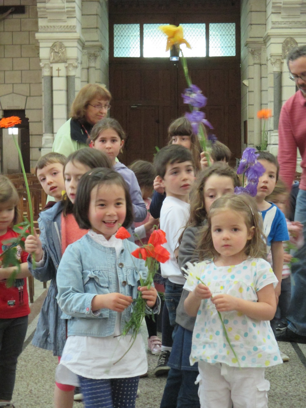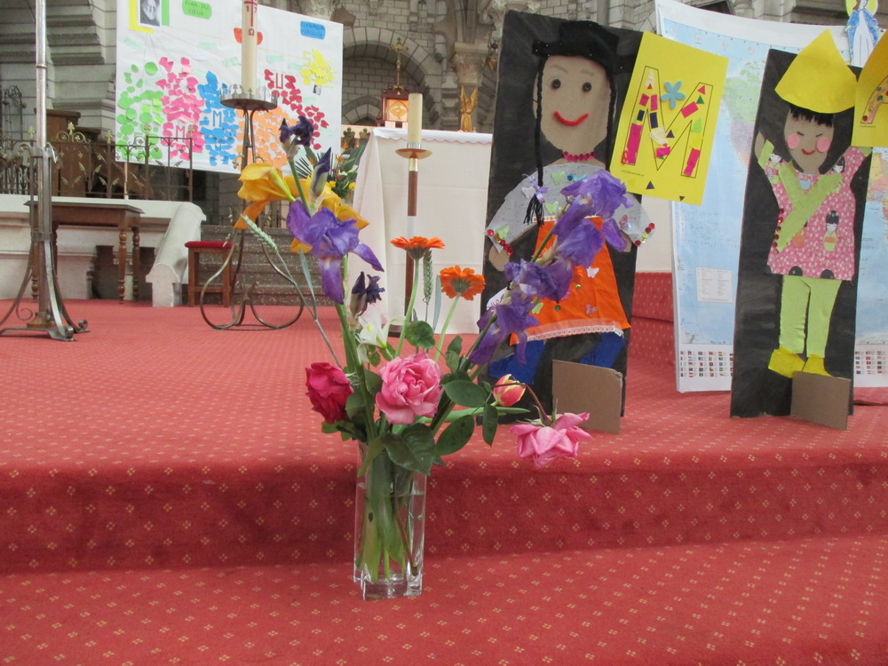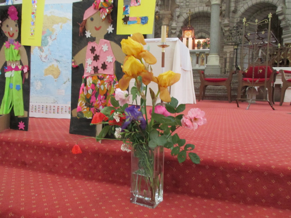 Comment ne pas rendre grâce à la Vierge Marie en lui offrant une fleur. Les enfants forment une procession et déposent chacun une fleur dans un vase, tout en chantant : « Tu es Marie la maman du Messie, tu es Marie notre maman aussi ». Deux beaux bouquets expriment ainsi notre reconnaissance à Marie.