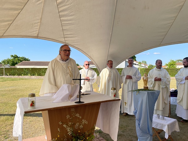 Mgr Jérôme Beau nous a rejoints sur le terrain de campement. Il a pris le temps de rencontrer chacun, jeunes comme adultes, puis a présidé la messe du soir avant de partager le repas avec nous.
