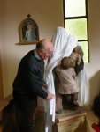 Nous avons fait tout ce chemin avec Marie, mais aussi avec notre mystérieux personnage : mais qui était-il ? Lentement, le Père Armel nous l’a fait découvrir en soulevant petit à petit le drap qui le recouvrait devant les yeux ébahis et admiratifs des petits comme des grands : une statue de St Vincent de 1,4 m de haut en argile offerte par le sculpteur Philippe le Moniès de Sagazan et qui accueillera désormais tous ceux qui entreront dans l’église.